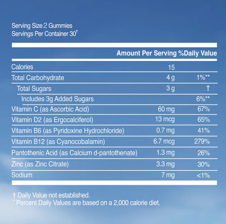 Ingredientes: Mistura Antioxidante (Romã (Fruta), Knotweed Japonês (Raiz), Uva, Açaí (Baga), Goji (Baga), Cereja (Fruta)), Mistura de Verdes (Chlorella, Espinafre, Spirulina, Brócolis, Broto de Bruxelas), Mistura Detox (Cúrcuma (Raiz) Cranberry, Cardo de Leite, Semente de Aipo, Folha de Urtiga), Support Blend (Echinacea, Sabugueiro, Folha de Moringa, Raiz de Astrágalo), Performance Blend (Juba de Leão, Reishi, Ashwagandha, Raiz de Beterraba), Mistura de Metabolismo (Folha de Chá Verde. Raiz de Gengibre, Casca de Canela), Curva da Beleza (Folha de Bambu, Tomilho3, Amla Fruta), Mistura Digestiva Pré + Probiótica (Inulina, Bacillus coagulans), Xarope de Glicose, Açúcar, Dextrose, Pectina, Citrato de Sódio, Éster de Ácido Graxo de Sacarose, Sabor Natural de Framboesa, Ácido Cítrico, Óleo de Girassol, Betacaroteno 1% e Cúrcuma (Para Cor), Concentrado de Suco de Cenoura Roxa e Espinafre em Pó.